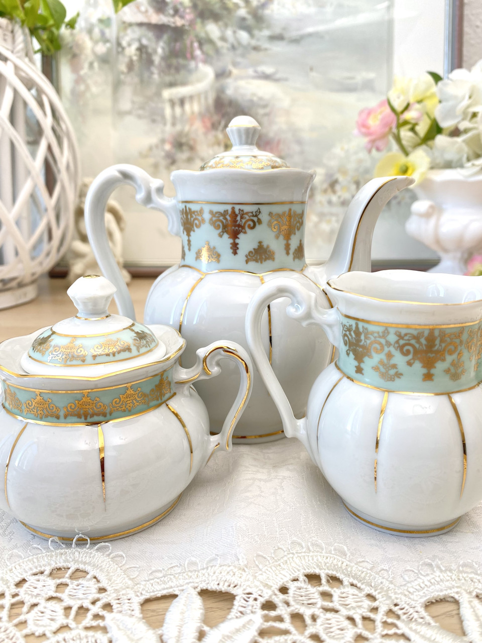 Комплект у досить хорошій безпеці, з недоліків тільки зчес на нижньому краї носика. Практично не помітний, але скол не міліметровий (показаний на фото), досить значний і цей недолік враховано у вартості. В іншому комплект дуже добре збережений, без потертостей, тріщин та інших недоліків. Комплект дуже витончений, витончений, невеликого розміру. На мій погляд, ідеальний для декорування інтер'єру або інших творчих ідей, для використання за прямим призначенням маломірить за розміром.