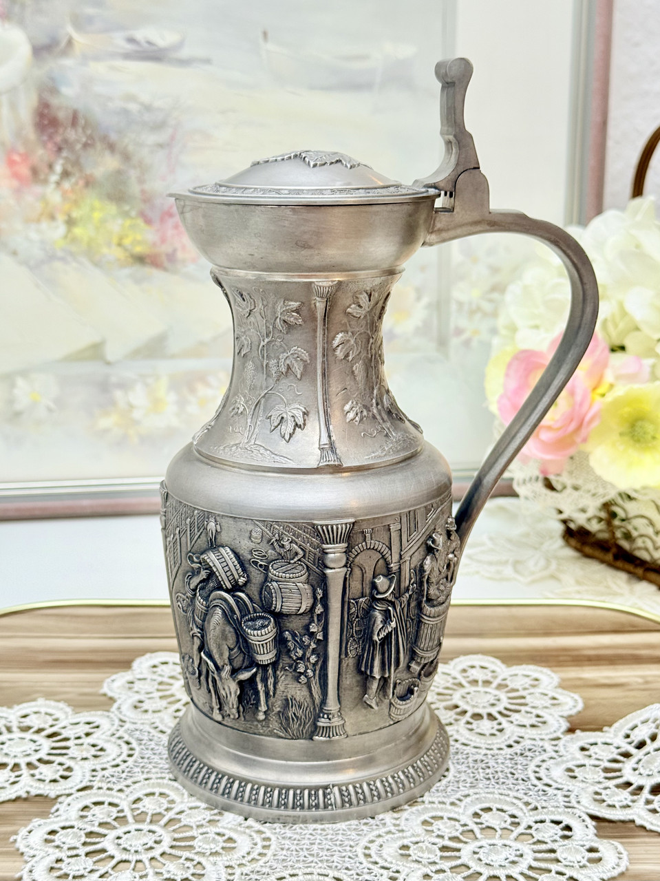 Колекційний олов'яний глечик із шикарним вираженим барельєфним, матеріал — харчове олово, високоякісне художнє лиття, Німеччина, остання третина XX століття, мануфактурне клеймо компанії SKS. Серія — Винарство. Розміри: максимальна висота 23 см, по денишку 9,5 см, по верхньому краю 8 см, максимальний діаметр приблизно 8,5 см, об'єм 800 мл; вага 850 грамів. Збереження дуже гарна, течі, вм'ятин та інших пошкоджень немає. Усередині глечик чистильний, без плям та інших вад.
